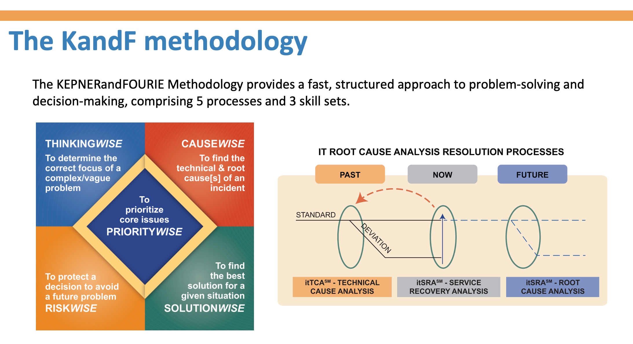 Root Cause Analysis helps prevent unnecessary and costly âTrial & Errorâ troubleshooting by using a step-by-step critical thinking process to identify, analyse, resolve, and stop incidents. Due to the specialised nature of fields such as Infrastructure, Database Management, Networking, Security/Risk, Development, and Design, IT professionals often lack a common structured skillset across their areas, which hinders their ability to solve incidents and problems effectively. âď¸Complex incidents can be reduced to one OBJECT and one FAULT, reducing complexity. âď¸ Easily establish the correct starting point quickly and efficiently. âď¸ Enhanced responsiveness by strengthening Silo relationships. âď¸ Practising the habit of asking the âright question to the right person to get to the right factual data.â âď¸ Templates support alliances with âTeam Silosâ and âVendorsâ, promoting shared responsibility in problem-solving. âď¸ Standard templates promote consensus and commitment for joint decisions, increasing the likelihood of successful implementation. Root Cause Analysis is applicable across all IT disciplines and is most effective when uniting these diverse skills through a common process and language to resolve incidents. The KEPNERandFOURIE⢠skillset taught in this training complements Problem Management initiatives. These skills can be quickly applied to incidents, problems, and projects or any challenging situation in the workplace, with outcomes measured in terms of time and cost savings, and higher quality.